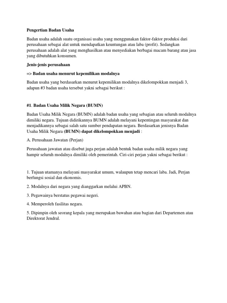 Badan Usaha Yang Seluruh Atau Sebagian Besar Modalnya Dimiliki Negara Disebut Python from imgv2-1-f.scribdassets.com Modal usahanya pun berasal dari pemerintah. Badan usaha milik negara yang selanjutnya disingkat bumn adalah badan usaha yang seluruh atau sebagian besar modalnya dimiliki oleh negara melalui penyertaan secara langsung yang berasal dari kekayaan negara yang dipisahkan, termasuk perusahaan yang dimiliki secara langsung oleh holding company yang merupakan bumn. Dec 18, 2020 · pada hakikatnya bumn adalah badan usaha yang melayani kepentingan masyarakat umum dan diawasi langsung oleh pemerintah. Dalam literatur fiqih, saham diambil dari istilah musahamah yang berasal dari kata sahm bentuk jamaknya ashum atau suhmah yang artinya bagian, bagian kepemilikan.artinya pemilik saham adalah pemilik perusahaan. Meskipun begitu, karyawan yang bekerja di bumn tidak disebut sebagai pegawai negeri, melainkan karyawan. Sesuai dengan namanya, bumn merupakan badan usaha yang seluruh atau sebagian modalnya dimiliki oleh pemerintah. Selain bumn, ada juga bumd (badan usaha milik daerah) yang keseluruhan atau sebagian modalnya adalah milik pemerintah daerah. Jun 09, 2021 · sebab, modal awal yang harus dimiliki terlalu besar dan sulit bagi perusahaan manapun untuk memenuhinya.